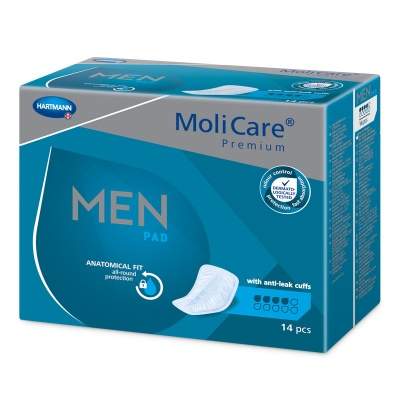 Absorpční pomůcky pro snadný únik moči pro muže. Savost 546 ml. Anatomicky tvarovaná vložka pro muže se pomocí lepícího proužku na vnější straně uchytí v prádle (nebo ve fixačních kalhotkách). Vložka se vyměňuje podle potřeby (několikrát denně).