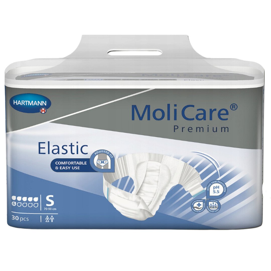 Zalepovací plenkové kalhotky s elastickými bočními pásy v modrém balení, obvod boků 50 – 90 cm, savost 6 kapek, 1784 ml. Použití: Plenkové kalhotky s lepícími pásky se používají způsobem ilustrovaným na zadní straně obalu. Plenkové kalhotky se svépomocí aplikují ve stoje, nebo za pomoci druhé osoby (ošetřovatele) v ležící poloze. Vyměňují se podle potřeby několikrát denně (každé 3-4 hodiny). Maximálně po 8 hodinách.