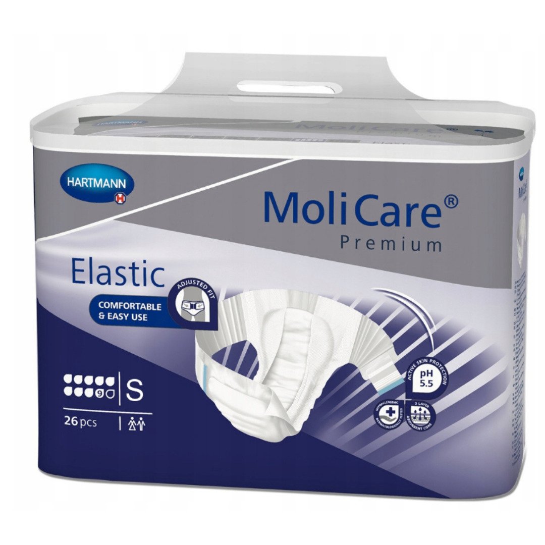 Zalepovací plenkové kalhotky s elastickými bočními pásy v tmavě modrém balení, obvod boků 50-90 cm, savost 9 kapek, 2859 ml. Použití: Plenkové kalhotky s lepícími pásky se používají způsobem ilustrovaným na zadní straně obalu. Plenkové kalhotky se svépomocí aplikují ve stoje, nebo za pomoci druhé osoby (ošetřovatele) v ležící poloze. Vyměňují se podle potřeby několikrát denně (každé 3-4 hodiny). Maximálně po 8 hodinách.