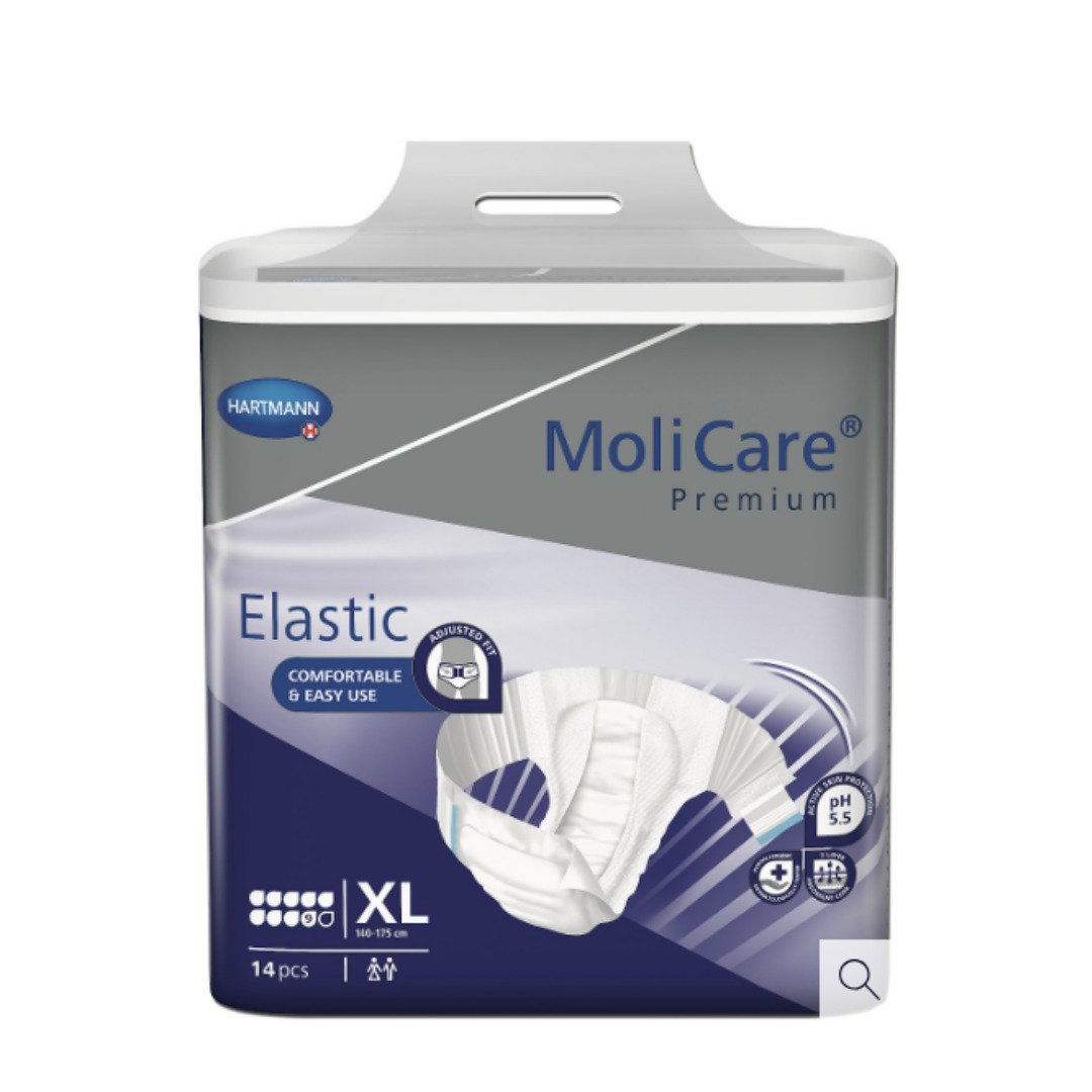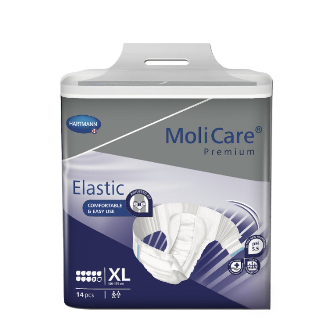 Zalepovací plenkové kalhotky s elastickými bočními pásy v tmavě modrém balení, obvod boků 140-175 cm, savost 9 kapek, 3951 ml. Použití: Plenkové kalhotky s lepícími pásky se používají způsobem ilustrovaným na zadní straně obalu. Plenkové kalhotky se svépomocí aplikují ve stoje, nebo za pomoci druhé osoby (ošetřovatele) v ležící poloze. Vyměňují se podle potřeby několikrát denně (každé 3-4 hodiny). Maximálně po 8 hodinách.