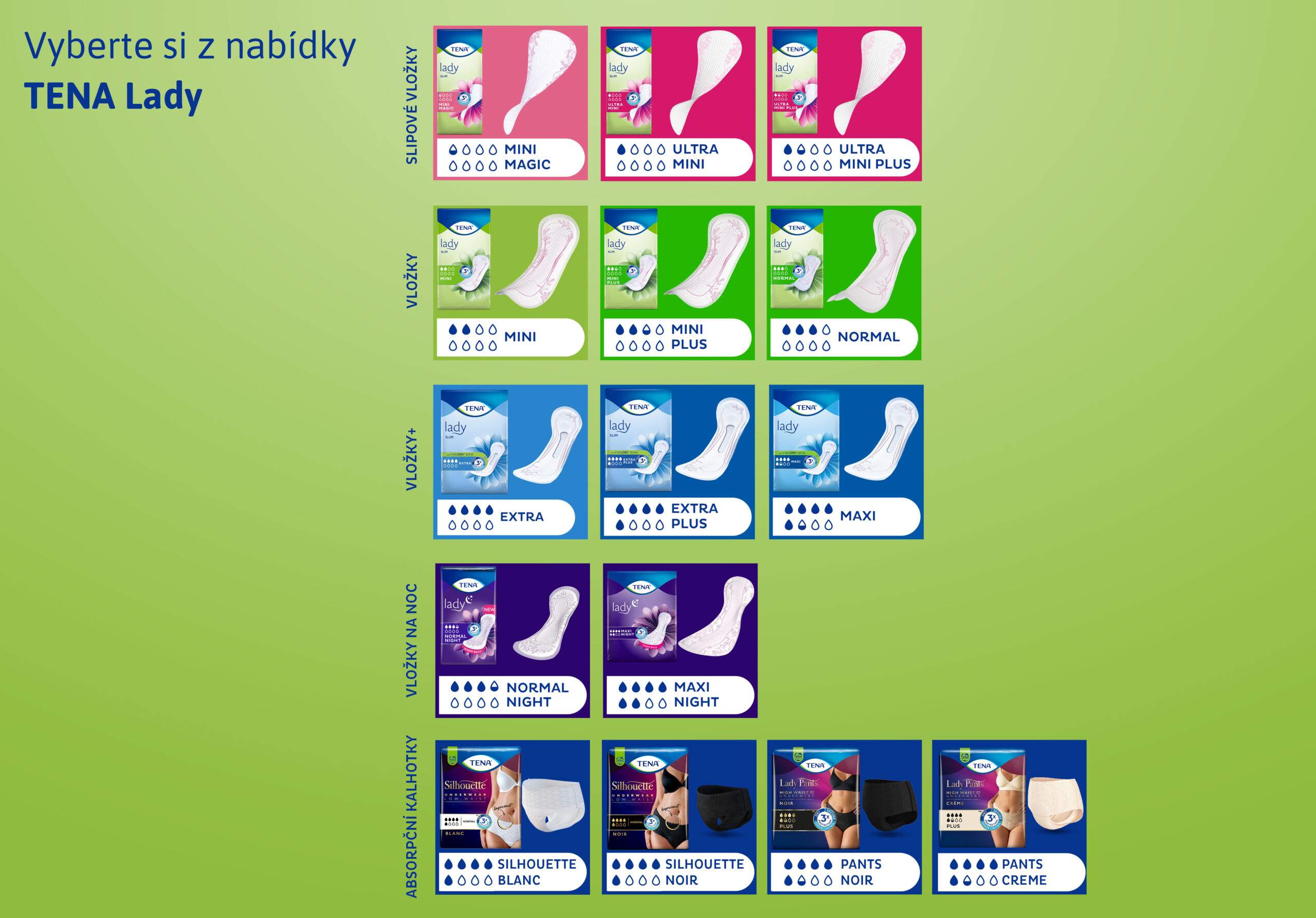 Anatomicky tvarované slipové vložky TENA Lady jsou speciálně vyvinuty pro ženy s velmi lehkým únikem moči. Díky systému trojité ochrany proti přetečení, vlhkosti a zápachu poskytují diskrétní a spolehlivou ochranu. Rychle absorbují moč a uzavřou ji uvnitř absorpčního jádra. Unikátní systém kontroly zápachu pomáhá eliminovat vznik nepříjemných pachů. Vložky jsou vyrobeny z dermatologicky testovaných materiálů, šetrných k pokožce a bez parfemace. S rozměry: 19,2 x 7,2 cm a s absorpcí 93 ml. Inkontinenční slipové vložky TENA Lady se fixují o spodní prádlo samolepícím páskem. Vložky se vyměňují podle potřeby (několikrát denně).