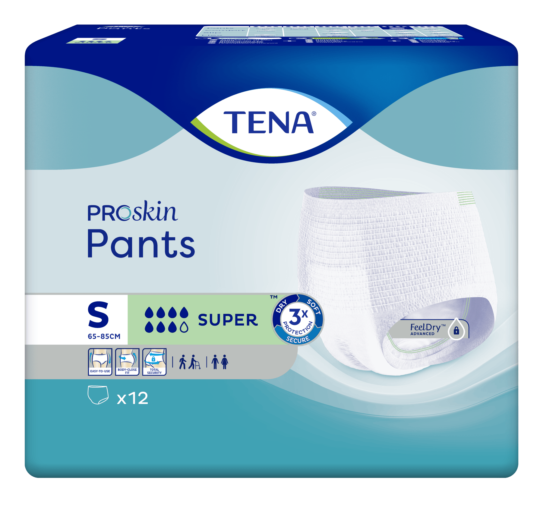 Natahovací absorpční kalhotky TENA Pants Super jsou praktickým řešením pro mobilní a částečně mobilní pacienty s těžkou inkontinencí. Vhodné pro ženy i muže. Jednoduše se oblékají a svlékají jako běžné spodní prádlo. Okamžitě absorbují moč a uzamknou ji uvnitř svého savého jádra, čímž podporují zdraví pokožky. Jsou obohaceny o systém trojité ochrany proti přetečení, pro pocit sucha a pohodlí. Systém kontroly zápachu Odour Neutralizer zabraňuje vzniku, růstu a šíření bakterií, které způsobují zápach. Absorpce 2010 ml, obvod boků: 65-85 cm. Absorpční kalhotky se jednoduše oblékají jako běžné spodní prádlo. Kalhotky se vyměňují několikrát denně.