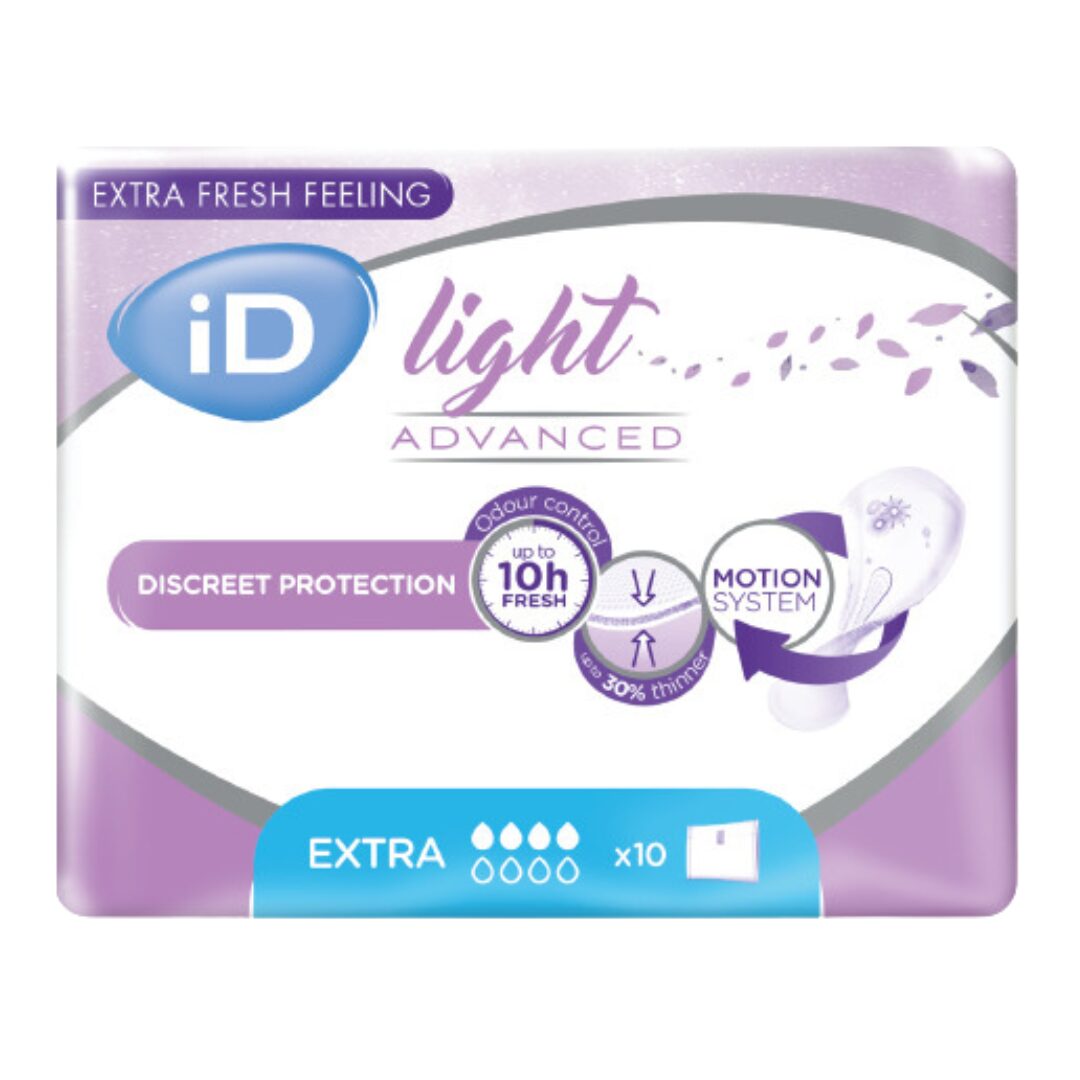 Vložky iD Light Advanced Extra jsou diskrétní, ultra pohodlné a poskytují ochranu při slabší funkci močového měchýře. Tento produkt je mimořádně flexibilní a účinný s technologií neutralizace trvající až 10 hodin. Anatomický tvar a lepicí proužek zajišťují, že vložka pohodlně sedí v prádle. iD Light Advanced Extra je ideální pro aktivní životní styl, který umožňuje svobodu pohybu, poskytuje ochranu proti únikům a kontrolu zápachu. Rozměr vložky: 33x13 cm